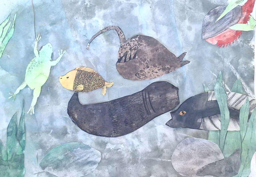 Das Kunstwerk des Monats wurde von Sara I. aus Jahrgang 5 zum Thema "Unterwasserwelt" gemalt. Es zeigt verschiedene Farbkontraste, Farbabstufungen und unterschiedliche Gestaltungstechniken. Sara entschied sich dabei für eine besonders originelle Idee und gestaltete einen Sumpf, den sie mit vielen Details und großer Sorgfalt ausarbeitete.