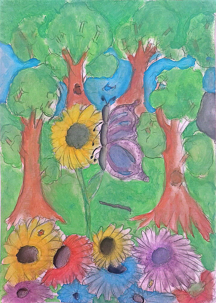 Das Kunstwerk des Monats Oktober wurde von Lana B. aus dem 5. Jahrgang gestaltet. Ihr farbenfrohes Bild zeigt einen lebendigen Urwald, in dem Komplementärkontraste und verschiedene Tiere zu entdecken sind.