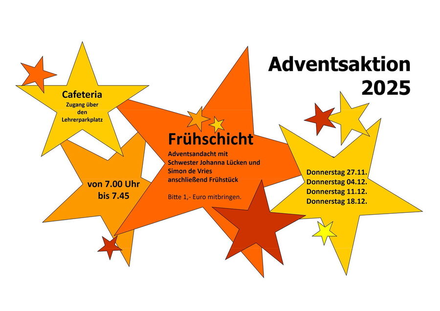 Gemeinsam mit Schwester Johanna Lücken und Pastor Simon de Vries findet dieses Jahr wieder an jedem Donnerstag vor den Weihnachtsferien eine Frühschicht statt. Wir beginnen den Schultag mit einer kurzen Adventsandacht, anschließend gibt es Frühstück.