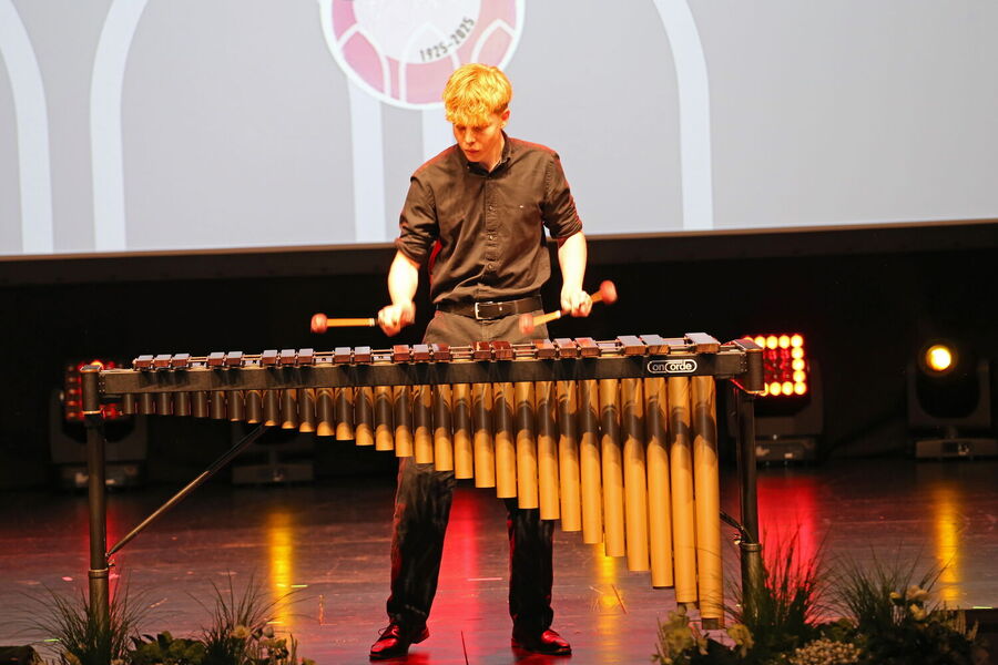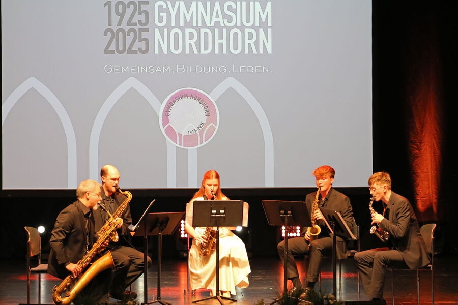 Musikalisch setzte der Festakt immer wieder Glanzpunkte. Die Schülerband „Notenlos“ eröffnete das Programm schwungvoll mit „I’m Still Standing“. Für Gänsehautmomente sorgte die kraftvolle Interpretation von „The Show Must Go On“ durch Emma Heetlage und Katharina Munk. Peter Voget begeisterte mit einer Darbietung am Marimbaphon. Klassische Akzente setzte ein Saxophon-Ensemble um Tom Straukamp, das zwei von ihm arrangierte Mozart-Werke präsentierte. Anna Kohoff übernahm zunächst den Gesangspart der Arie der Susanna aus der „Hochzeit des Figaro“, bevor sie gemeinsam mit Malte Eggers, Thorben Groven, Pascal Schweren und Tom Straukamp die Ouvertüre zur „Zauberflöte“ spielte. Einen besonderen Moment bot auch der Auftritt von Gundel Jannemann-Fischer, die das Publikum mit einem Englischhorn-Solo berührte.