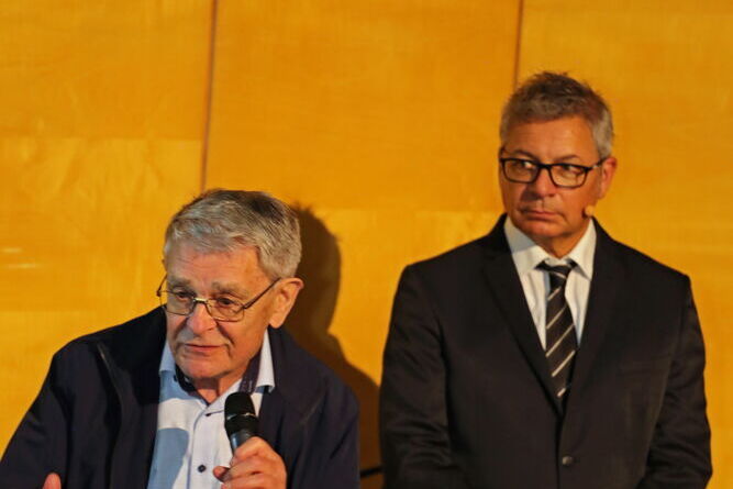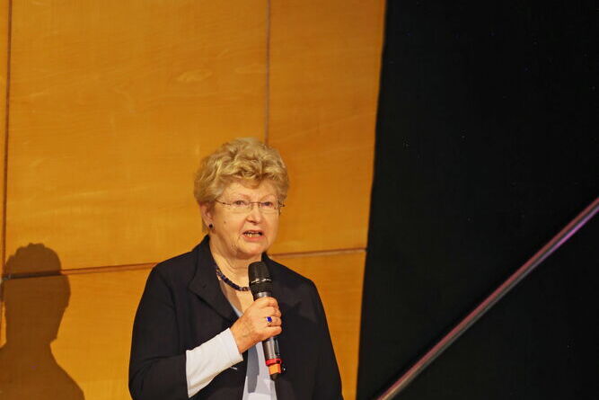 Höhepunkte voller Emotionen setzten auch persönliche Begegnungen: Als die ehemalige Schulleiterin Monika Woltmann und Karl Ludwig Galle, der gerade seinen 97. Geburtstag gefeiert hatte, begrüßt wurden, stimmte das gesamte Publikum ein „Happy Birthday“ an. Monika Woltmann mahnte in ihrer Rede zur Wachsamkeit gegenüber Ideologien und plädierte für eine Schule, in der Offenheit und freie Meinungsäußerung gelebte Praxis bleiben.