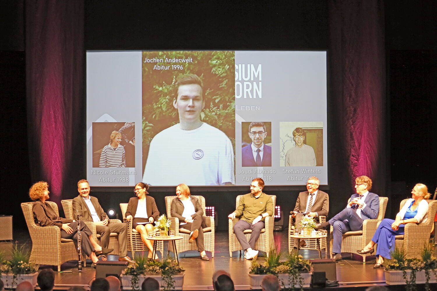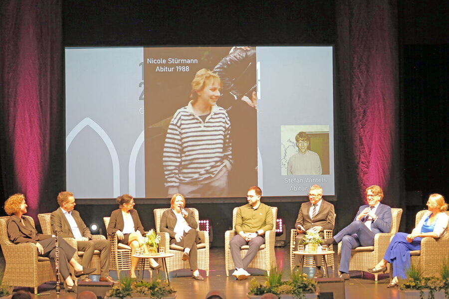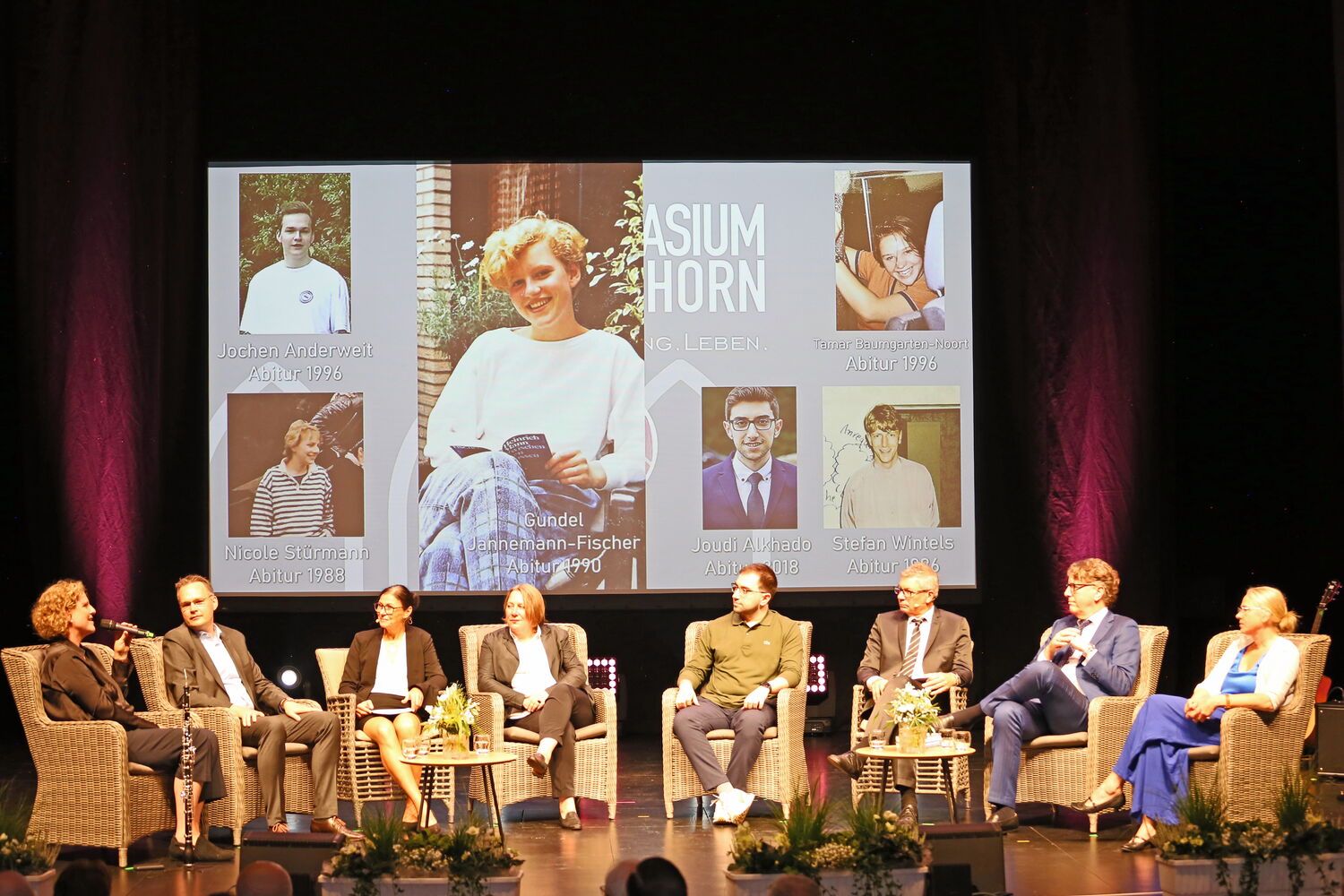 Wie sehr das Gymnasium Nordhorn seine Schülerinnen und Schüler auch über die Schulzeit hinaus prägt, zeigte sich eindrucksvoll in der lebendigen Talkrunde mit sechs ehemaligen Absolventinnen und Absolventen. In persönlichen Gesprächen, unterbrochen von kurzen Blitzlichtern zu Lieblingsfächern, besonderen Lehrerpersönlichkeiten oder dem größten Unsinn, den man einst auf dem Schulhof trieb, entstand ein facettenreiches Bild schulischer Prägung. Stefan Wintels, Nicole Stürmann, Joudi Alkhado, Jochen Anderweit, Tamar Baumgarten-Noort und Gundel Jannemann-Fischer berichteten offen, ehrlich und mit viel Persönlichkeit von ihren beruflichen Werdegängen, prägenden Erlebnissen und entscheidenden Weggabelungen im Leben. Die Themen reichten von Bildungsgerechtigkeit und sozialem Aufstieg über internationale Erfahrungen bis hin zu künstlerischen Karrieren und gesellschaftlichem Engagement. Anekdoten aus dem Schulalltag sorgten für Schmunzeln im Publikum – und machten deutlich: Das Gymnasium Nordhorn ist weit mehr als ein Lernort. Es ist ein Ort der Begegnung, der Inspiration und der Weichenstellung fürs Leben.