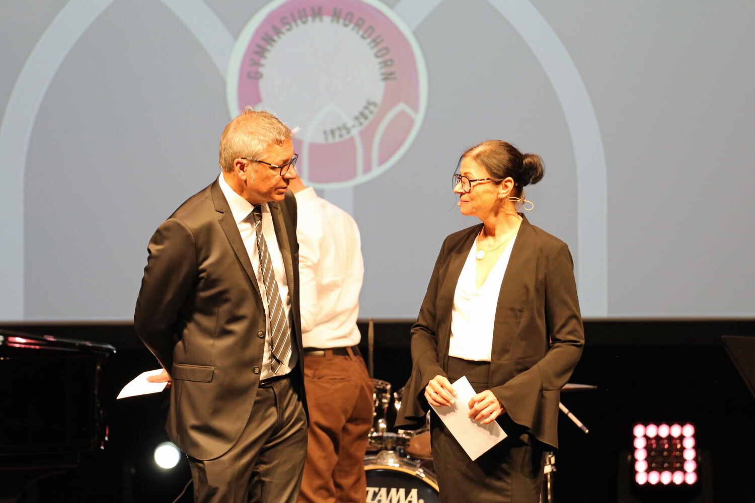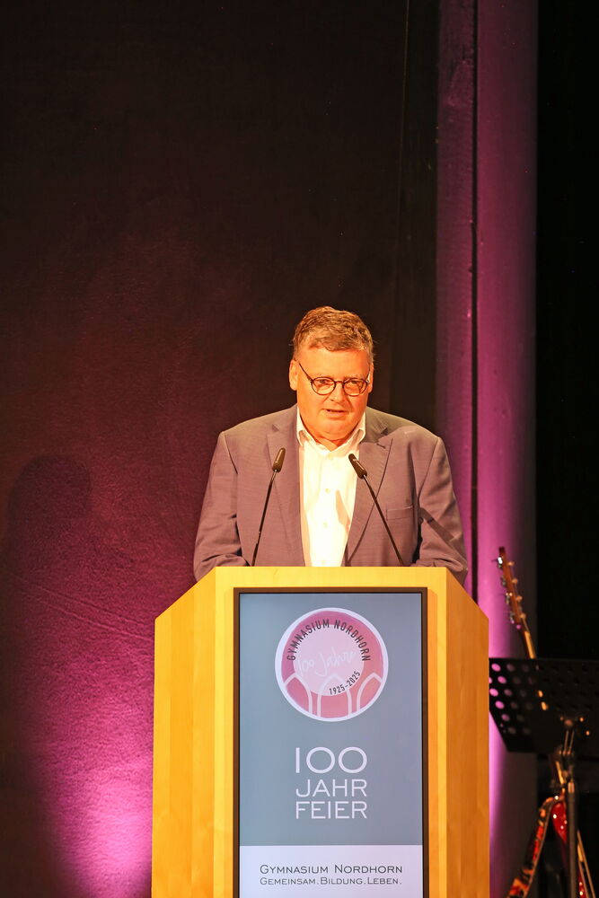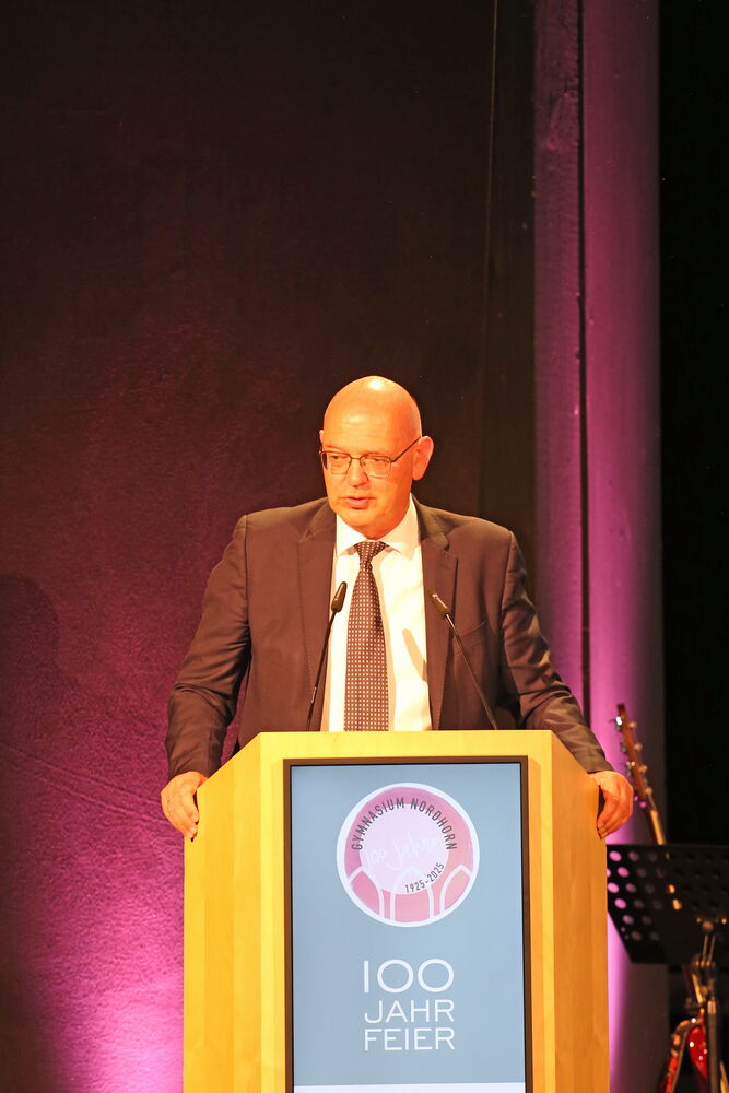 Schon zu Beginn wurde deutlich, wie viel das Gymnasium Nordhorn für Stadt und Region bedeutet. Schulleiter Andreas Langlet spannte in seiner Begrüßung einen weiten Bogen von der Gründung im Jahr 1925 bis in die Zukunft, getragen vom neuen Leitbild: Gemeinsam. Bildung. Leben. Dieses Leitbild präge nicht nur den Schulalltag, sondern habe sich bereits im Jubiläumsjahr in vielfältigen Aktionen und Veranstaltungen widergespiegelt. Mit Blick auf digitale Herausforderungen, etwa durch den Einsatz Künstlicher Intelligenz, betonte Andreas Langlet, Bildung müsse über reines Faktenwissen hinausgehen und junge Menschen dazu befähigen, kritisch zu denken, Verantwortung zu übernehmen und als Persönlichkeiten zu wachsen.