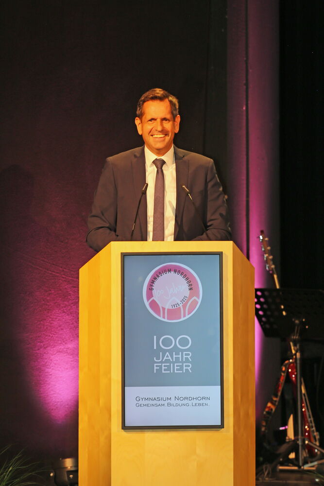 Diesen Gedanken griff auch Niedersachsens Ministerpräsident Olaf Lies auf. In seiner Ansprache betonte er, dass Bildung mehr bedeutet als reine Wissensvermittlung. Es gehe nicht allein um das Erlernen von Fakten, sondern um die Fähigkeit, Informationen zu bewerten, Zusammenhänge zu verstehen und mit Neugier, Respekt und Verantwortungsbewusstsein in eine komplexe Welt zu treten. Er wisse, dass das Gymnasium Nordhorn als Ort der Persönlichkeitsentwicklung diese Werte vermittle, ein Ort, an dem nicht nur gelernt, sondern auch gestaltet, diskutiert, musiziert und geforscht werde. Dass die Schule über ein eigenes Filmstudio verfüge, sei ein Beispiel für moderne, kreative Bildung, die Jugendlichen Freiraum für Entfaltung gebe. Ein gutes schulisches Umfeld, so Olaf Lies, biete Halt, Orientierung und zugleich Raum für Kreativität, soziales Engagement und Wohlbefinden. Denn nur wer sich wohlfühle, könne gut lernen und wachsen. Das Gymnasium Nordhorn sei in diesem Sinne ein leuchtendes Beispiel für gelungene Bildungsarbeit.