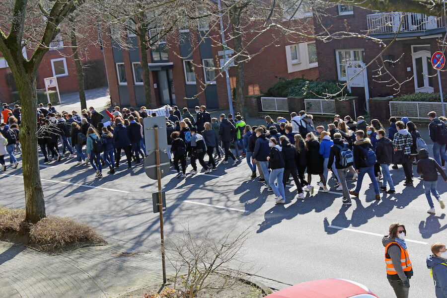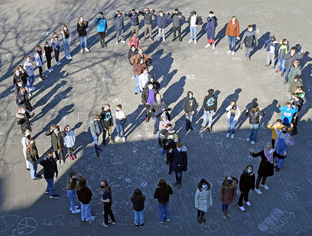 Vor dem Beginn des Friedensmarsches trafen sich bereits die Lateinschüler und -schülerinnen der sechsten Klassen auf dem Schulhof und formten ein Peace-Zeichen. Um 11.40 Uhr strömten alle Schülerinnen und Schüler jeglicher Altersstufe dazu, um von dort gemeinsam durch die Innenstadt Richtung Markplatz zu marschieren. 700 Teilnehmer - eine beeindruckende Zahl! Ruhig und diszipliniert machte sich die große Menge der jungen Menschen unter Einhaltung aller geltenden Regeln auf den Weg über die Jahnstraße und durch die Innenstadt Richtung Marktplatz, wo die große Kundgebung aller teilnehmenden Schulen den Höhepunkt der Veranstaltung bildete. „Für den Frieden“, „Peace“, „Stoppt den Krieg“ und andere Parolen oder Zeichen des Friedens konnte man auf den selbstgebastelten Plakaten lesen. Die Menschen am Wegesrand zeigten allein schon durch ihre Mimik, aber auch durch andere Gesten und Worte, wie beeindruckt sie von dem Engagement der jungen Teilnehmer waren.