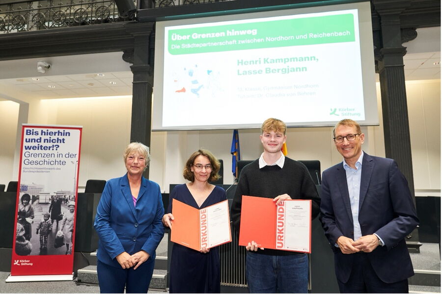 Nicht weniger verdient war die Auszeichnung für Lasse Bergjann und Henri Kampmann. Auch Lasse und Henri haben sich für einen Podcast entschieden, allerdings zu einem ganz anderen Thema: Inspiriert durch einen Besuch im Kreis- und Kommunalarchiv, stellten sie die Städtepartnerschaft zwischen Nordhorn und Reichenbach in den Mittelpunkt ihrer Forschungen und zeichneten die Geschichte dieser Partnerschaft, ihre Entwicklung und Bedeutung nach. Als Glücksfall erwies sich hierbei die Zusammenarbeit mit Herrn Rolf Masselink, seines Zeichens ehemaliger Chefredakteur der „Grafschafter Nachrichten“, der als Reporter beim ersten Treffen der beiden Bürgermeister in Reichenbach dabei gewesen war und sich bereiterklärt hatte, als Zeitzeuge Rede und Antwort zu stehen.
