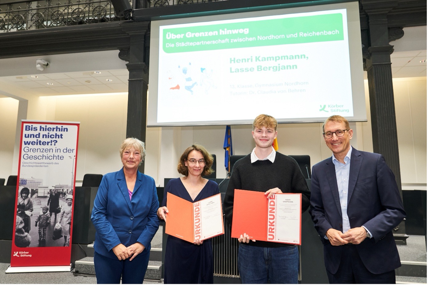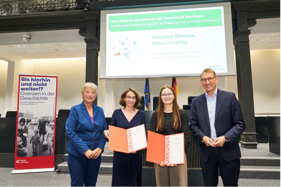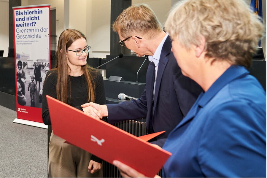 Und es geht noch weiter: Parallel zum Europäischen Wettbewerb haben Schülerinnen und Schüler aus dem Seminarfach sf4 und dem Geschichtskurs ge1 Beiträge für den alle zwei Jahre stattfindenden Geschichtswettbewerb des Bundespräsidenten erarbeitet, der das gleichfalls mehrdeutige Thema „Grenzen“ in den Mittelpunkt stellte. Die Konkurrenz war diesmal so stark wie nie, denn es wurden insgesamt 2289 Arbeiten (von 6727 Teilnehmerinnen und Teilnehmern) eingereicht. Diese vorab veröffentlichten Zahlen ließen das Herz zunächst etwas sinken, bedeutete dies doch natürlich – obgleich von der Qualität unserer eingereichten Beiträge überzeugt – geringere Gewinnchancen. Anfang Juni kam dann die erfreuliche Nachricht der Körber-Stiftung, dass sage und schreibe zwei Arbeiten mit einem der begehrten niedersächsischen Landespreise ausgezeichnet worden sind.