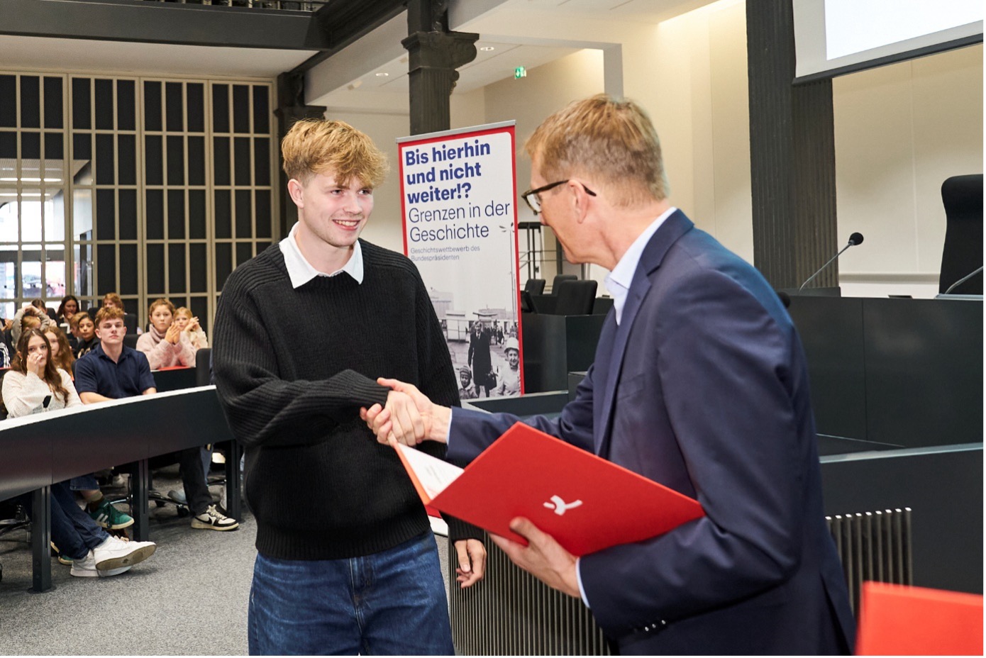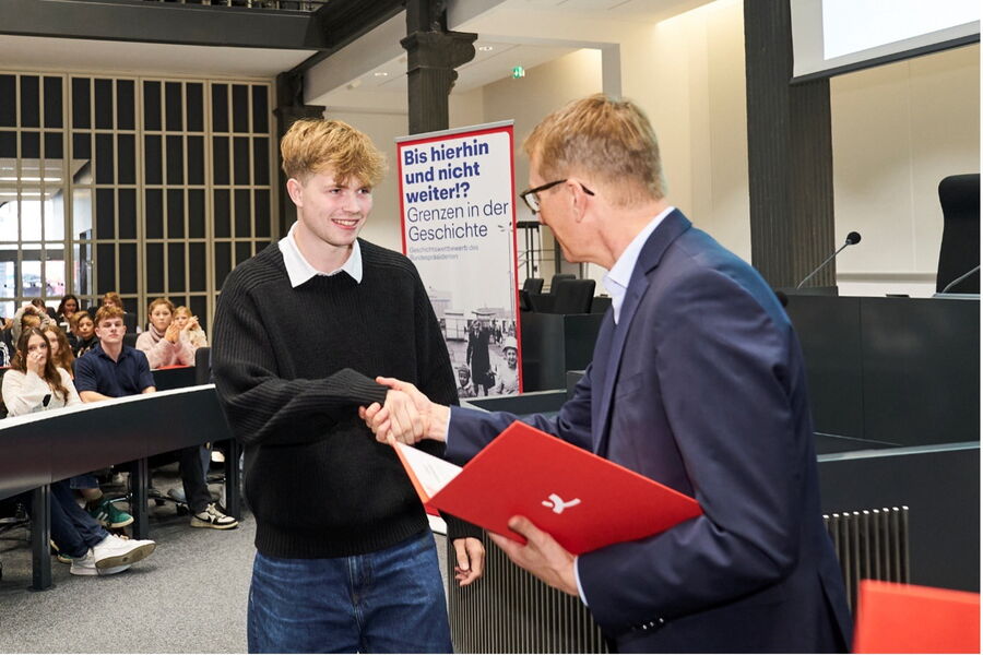 Marit, Kevin, Philip, Lennart und Felix konnten diese Preise am 13. Mai 2025 in der wieder einmal beeindruckenden Atmosphäre des Forums des Niedersächsischen Landtags in Empfang nehmen. Der Fokus des Festaktes lag eindeutig auf der Würdigung der Beiträge, was die Preise selbst (Büchergutscheine im Wert von jeweils 20,- Euro) sowie das Rahmenprogramm (ein gemeinsames Mittagessen und eine kurze Führung durch die Portikushalle und den Plenarsaal) fast etwas in den Hintergrund geraten ließ. Im Anschluss haben wir dann unter Beweis gestellt, dass man in acht Minuten vom Landtag zum Hauptbahnhof fahren und rennen kann (mit Wahl des falschen Ausgangs an der U-Bahn-Station, wohlgemerkt), und auch die Bentheimer Eisenbahn war so freundlich, auf die vielen, aus Richtung Bielefeld kommenden Fahrgäste zu warten, sodass wir nicht allzu spät wieder in Nordhorn angekommen sind. Noch einmal herzlichen Glückwunsch an alle Gewinnerinnen und Gewinner!