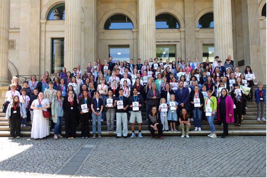 Am 23. September 2025 machten wir uns auf den Weg nach Hannover, um die Urkunden in Empfang zu nehmen (das Preisgeld in Höhe von 500,00 Euro pro Landessieg war bereits vorab überwiesen worden). Leider konnten Hristina und Lasse berufsbedingt nicht an der Preisverleihung im Forum des Niedersächsischen Landtags teilnehmen, sie wurden aber von Nina und Henri würdig vertreten – hierbei ist insbesondere Nina hervorzuheben, die das Glück (?) hatte, von der Moderatorin zu ihrem Wettbewerbsbeitrag befragt zu werden, und diese Herausforderung souverän meisterte. Nach der offiziellen Veranstaltung wurde noch zu einem Mittagessen in einem nahegelegenen Restaurant geladen, bevor wir uns wieder auf den Weg Richtung Grafschaft oder, wie in Ninas Fall, Richtung Bayern machten.