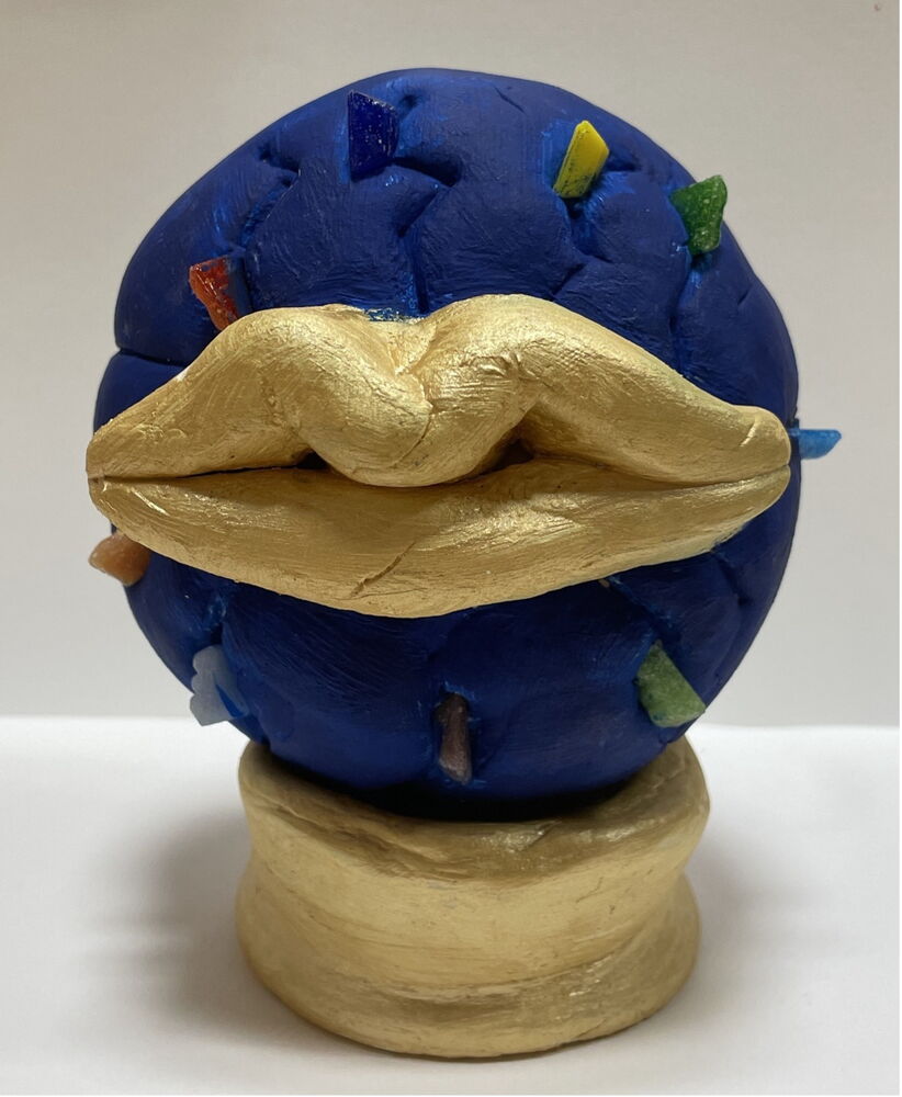 Die Skulptur stellt die Freiheit der Meinungsäußerung dar. Die blaue Kugel symbolisiert die Welt und gleichzeitig Grenzen, die Menschen in ihrer Ausdrucksfreiheit erleben. Der goldene Mund, der aus der Kugel hervorbricht, steht für die Kraft und den Wert der eigenen Stimme. Die bunten Mosaikstücke zeigen unterschiedliche Menschen und Perspektiven. Sie machen deutlich, dass Meinungsfreiheit vielfältig ist und für alle gelten soll.