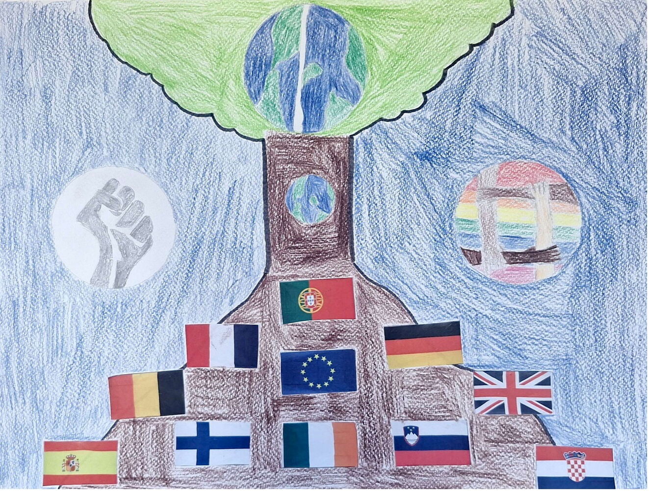 Das Bild stellt die Diskriminierung wegen der Herkunft dar. Die rechte Abbildung zeigt, dass jeder gleich viel wert ist. Die linke zeigt, dass wir alle zusammenhalten sollten. Die Abbildung in der Mitte zeigt einen Baum mit Wurzeln. Die Länder sind der Grundstein für den Stamm. Wenn alle Länder zusammenhalten, dann sind wir eine gesunde Gesellschaft. Doch wenn wir nicht zusammenhalten, dann spaltet sich die Gesellschaft, was die Krone darstellt, da sie viele Äste und Zweige hat.