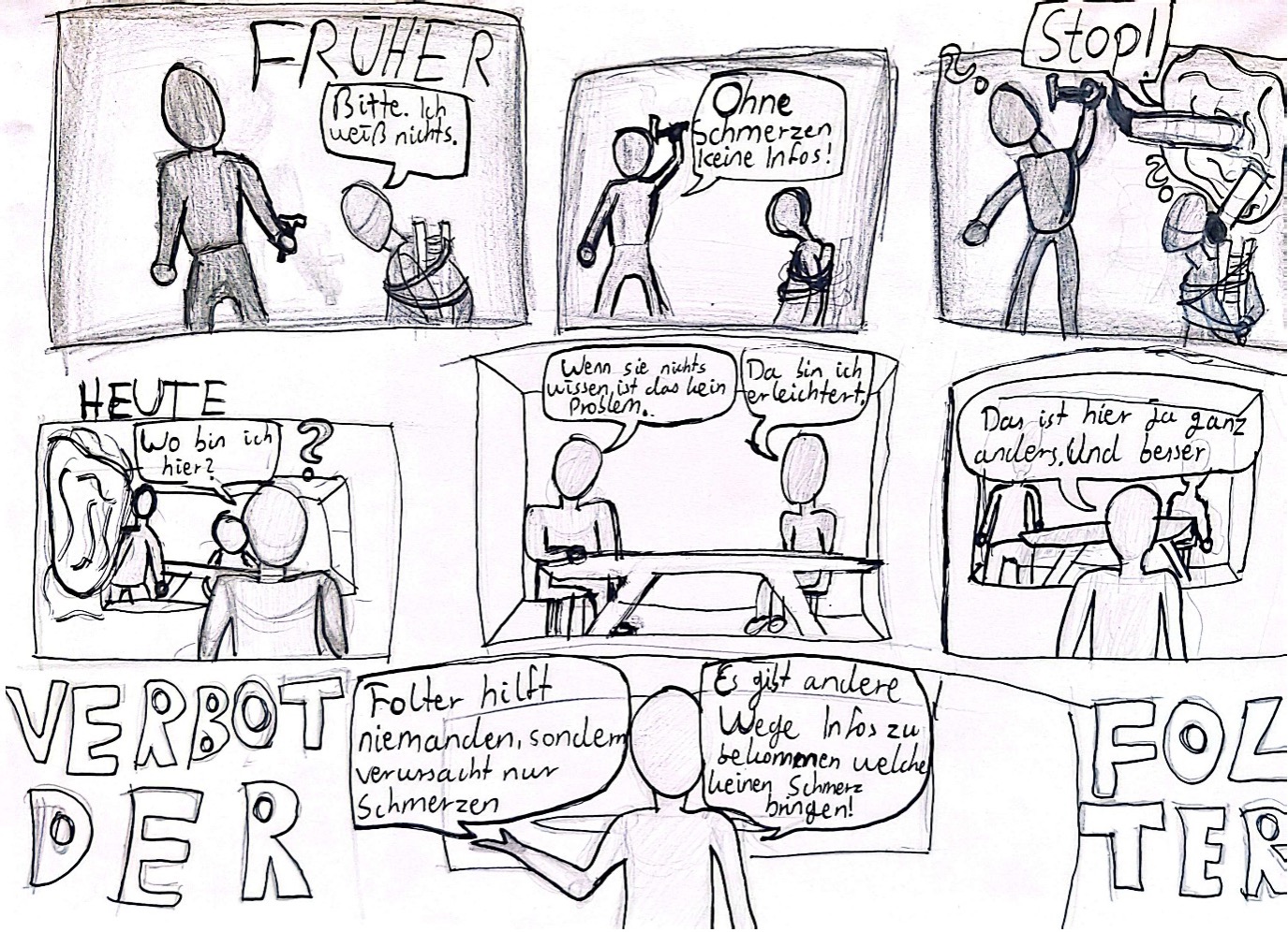 Unser Comic stellt das Verbot der Folter dar. Jemand ist auf dem Stuhl gefesselt und ihm wird gedroht. Die Person, die foltert, hat einen Hammer in der Hand. Folgend öffnet sich ein Portal, welches die Personen in die Zukunft zieht. Folter ist nun verboten und Schweigen wird akzeptiert.